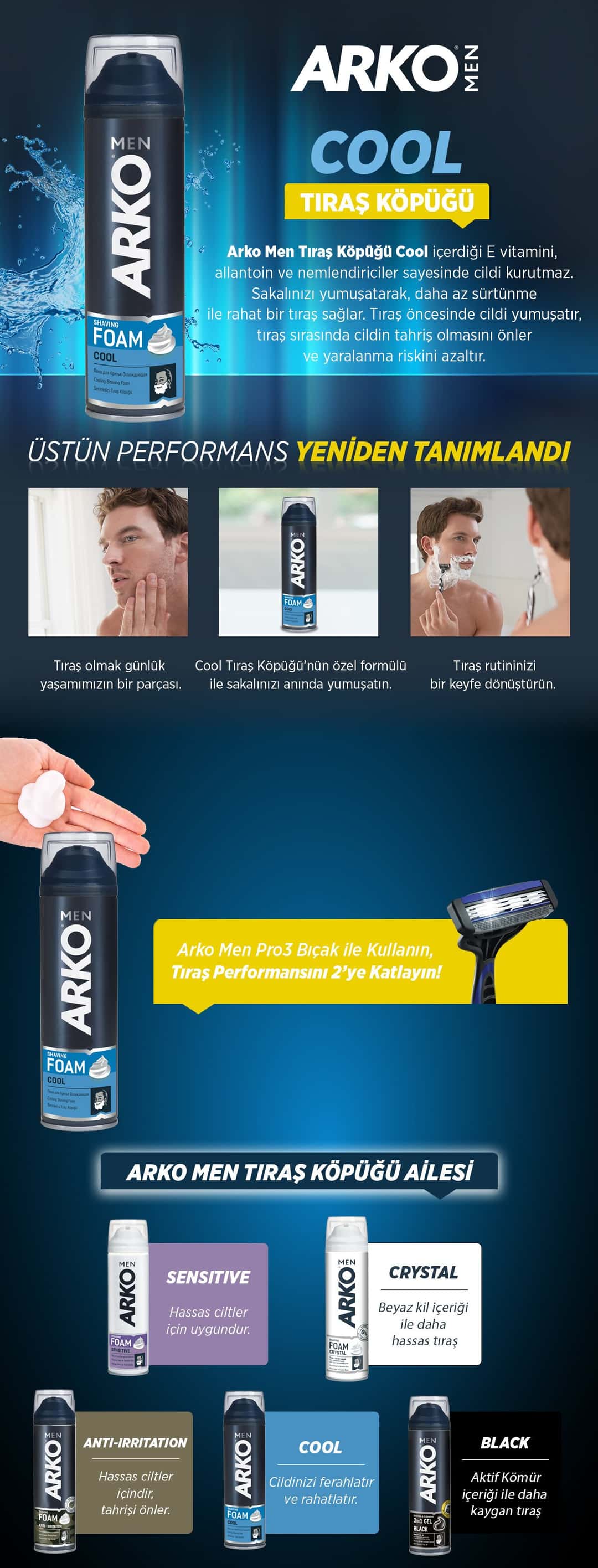 Arko Men Tıraş Köpüğü geliştirilmiş özel formülü ile daha rahat ve pürüzsüz bir tıraş deneyimi sağlar. Arko Men Cool Tıraş Köpüğü, formülündeki E vitamini ve özel kokusu ile serinletici bir tıraş deneyimi sunar.