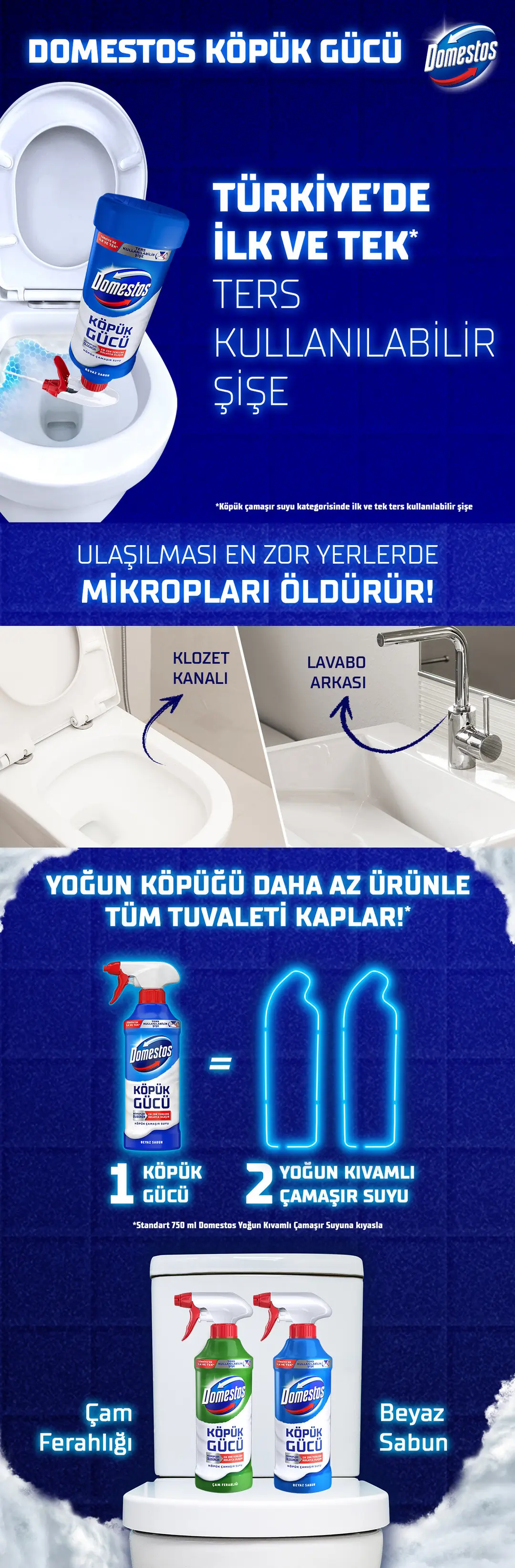 Yeni Domestos Köpük Gücü Beyaz Sabun, Türkiye’de ilk ve tek ters kullanılabilir şişesi ile hijyen anlayışınızı yeniden tanımlıyor. Bu ürün, ulaşılması en zor yerlerde bile maksimum hijyen sağlama amacıyla Domestos uzmanları tarafından geliştirilmiştir. Eşsiz ters kullanılabilir şişe tasarımı sayesinde, klozet kanalı, lavabonun arkası gibi ulaşılması zor alanlara ulaşabilir ve yoğun köpüğü sayesinde daha az ürünle tüm yüzeyi etkili bir şekilde temizleyebilirsiniz.
