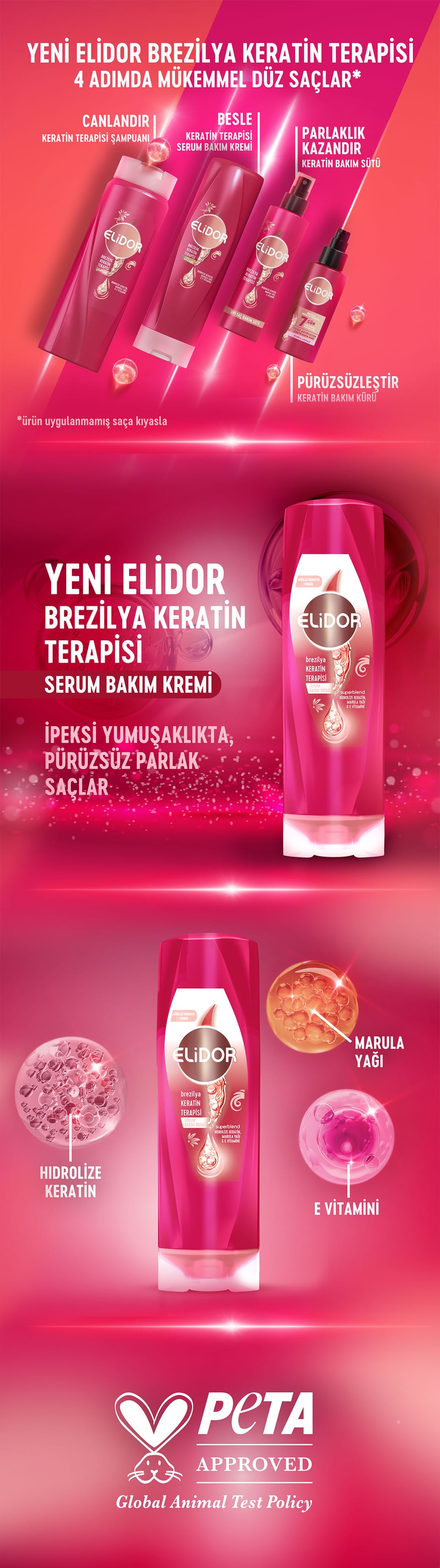 Elidor Brezilya Keratin Terapisi Saç Bakım Kremi ile Mükemmel Düz Saçlar! Saç bakım markası Elidor yenilendi! Saç bakım rutinine yepyeni bir dokunuş katmak için Elidor Brezilya Keratin Terapisi Saç Bakım Kremi’ni hemen keşfet! Özel olarak geliştirilen formülüyle saçlarını derinlemesine besleyerek elektriklenmeyi azaltır. Sonuç? Elidor Brezilya Keratin Terapisi Saç Bakım Kremi ile 7 gün boyunca mükemmel düz saçlar! Saçların daha pürüzsüz, daha yumuşak ve kolay şekil alır hale gelir.