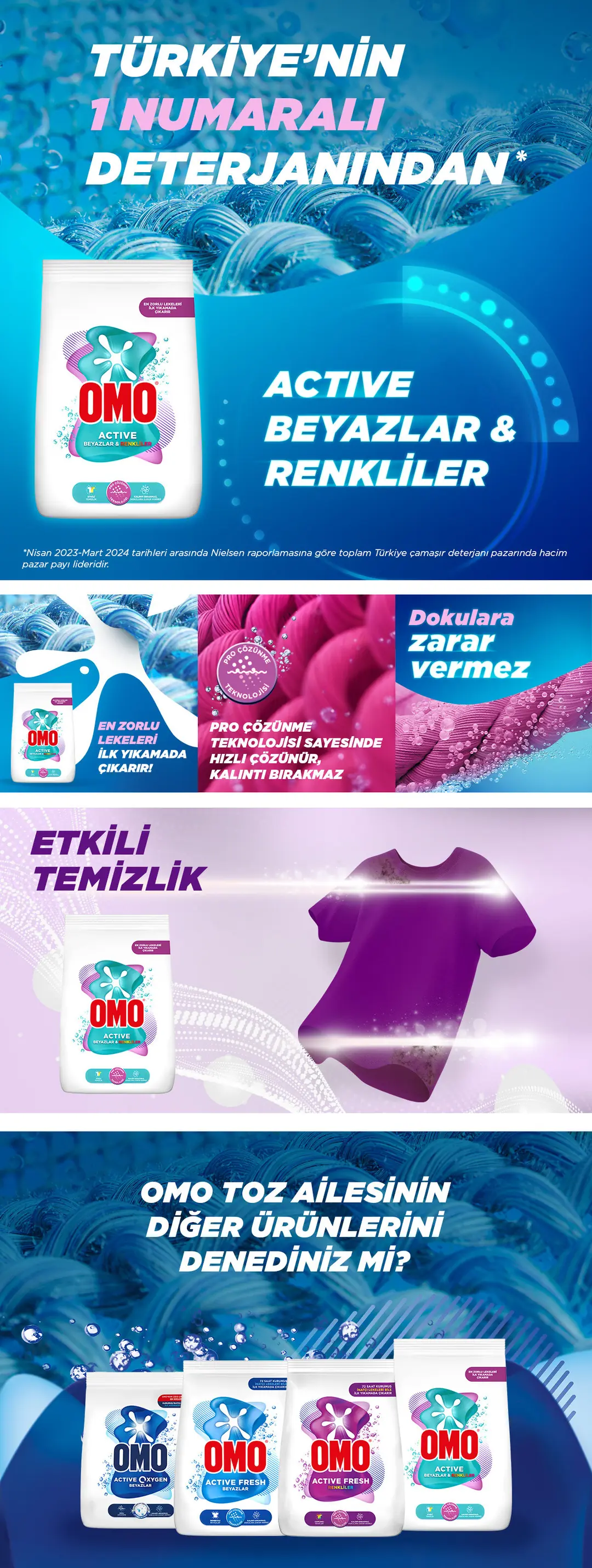 Türkiye’nin 1 numaralı deterjan markası OMO’nun toz deterjanları yenilendi. OMO Active Beyazlar & Renkliler Toz Deterjan en zorlu lekeleri ilk yıkamada çıkarırken beyaz ve renklilerinizde etkili temizlik sağlar! Pro Çözünme Teknolojisi sayesinde hızla çözünerek çamaşırlarınızda kalıntı bırakmaz, dokulara zarar vermez. OMO Active Beyazlar & Renkliler, doğada çözünebilir içeriklere ve %100 geri dönüştürülebilir ambalaja sahiptir.